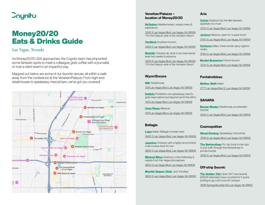 If you’re looking for alternative locations for networking, eating and drinking, Cognito has created a map of suggested locations. These come straight from the mouths (or inboxes) of trusted industry allies who frequent Vegas often. If you’re looking to entertain clients or teammates next time you’re in Vegas, try these places: